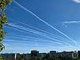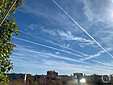 Утром 2 октября жители увидели ясное небо, разрисованное вдоль и поперек белыми полосами. Необычный узор словно «зебра» держится уже несколько часов.