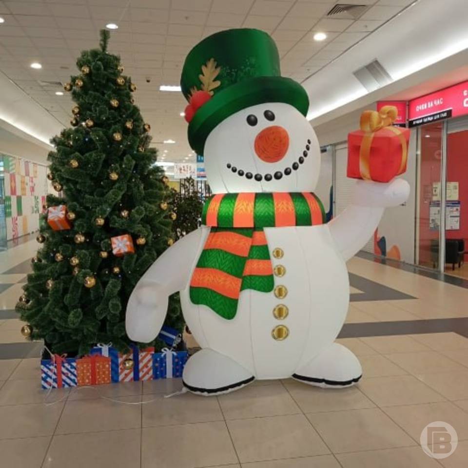 Коридор ТРЦ «Парк Хаус» украсила скромная елочка. Все внимание забрал на себя огромный снеговик с большим подарком в руках.