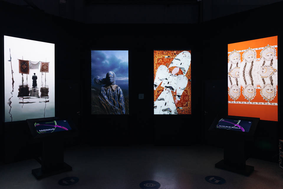 Выставка охватывает пять залов, где на 60 цифровых полотнах или экранах представлены работы 14 художников из России, Индии, Аргентины, Бразилии, Азербайджана, Китая и Нидерландов.
