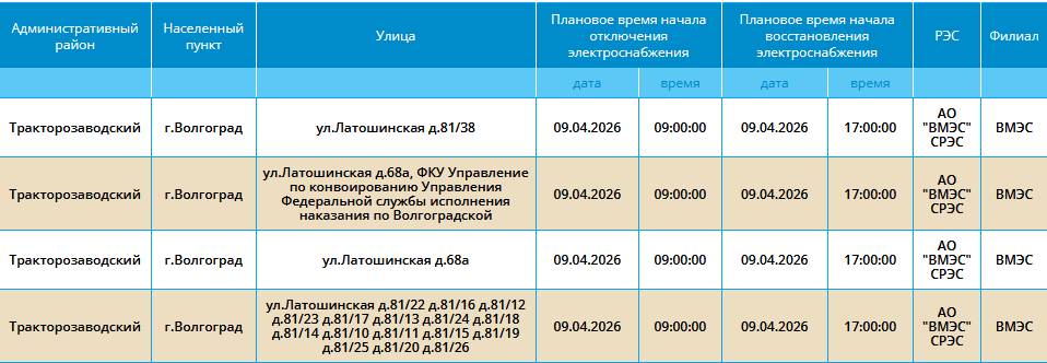 В Тракторозаводском районе Волгограда 9 апреля отключат свет.