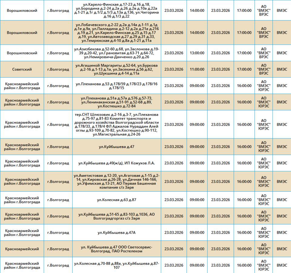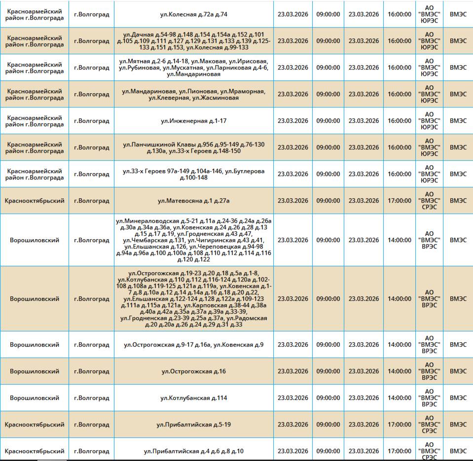 Четыре района Волгограда останутся без света в понедельник, 23 марта, сообщает пресс-служба компании «Россети Юг». Электричества не будет в Ворошиловском, Красноармейском, Краснооктябрьском и Советском районах областного центра.