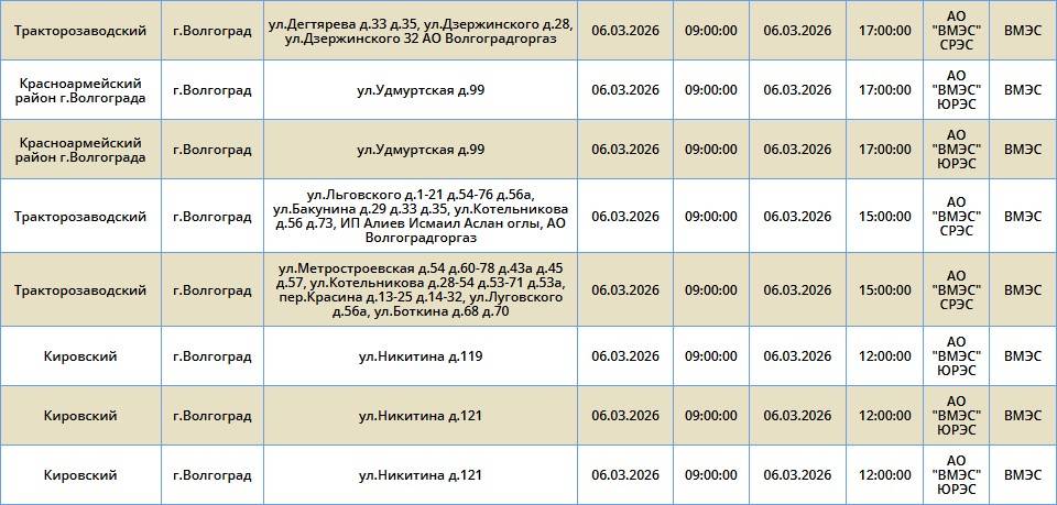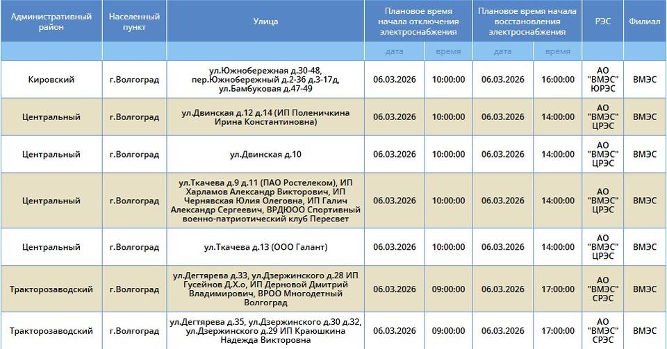 В пятницу, 6 марта, в четырех районах Волгограда ожидается отключение электроэнергии. Света не будет в Кировском, Центральном, Тракторозаводском и Красноармейском районах. Об этом сообщает компания «Россети Юг».