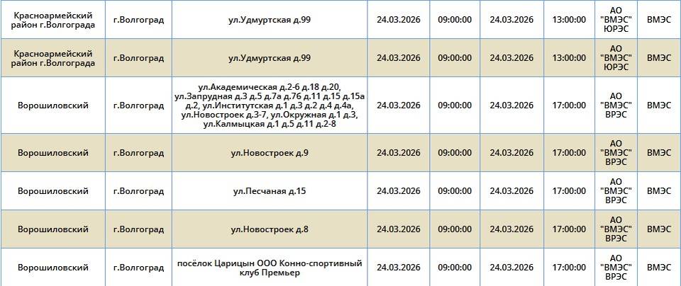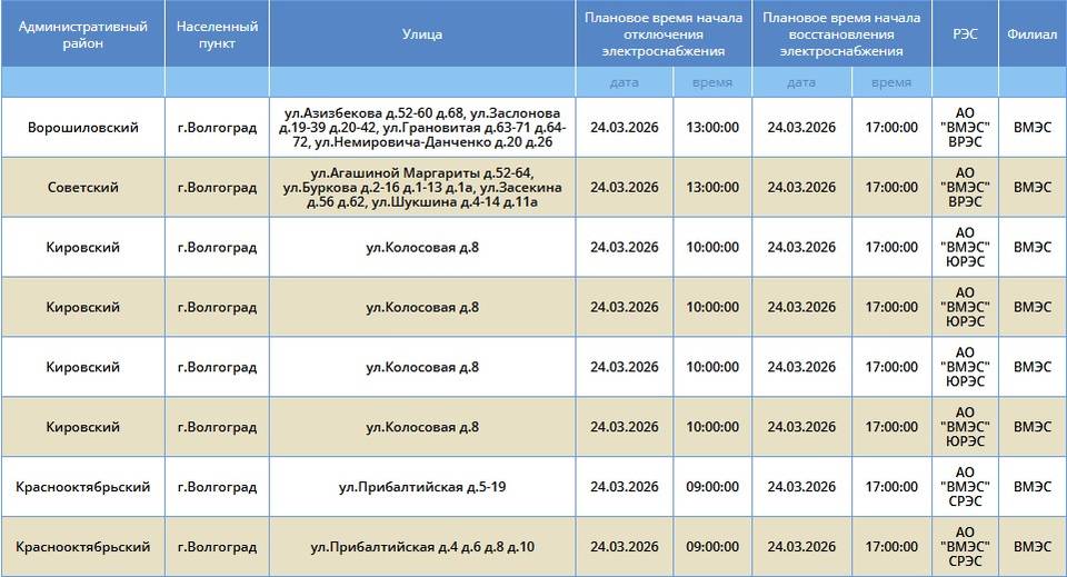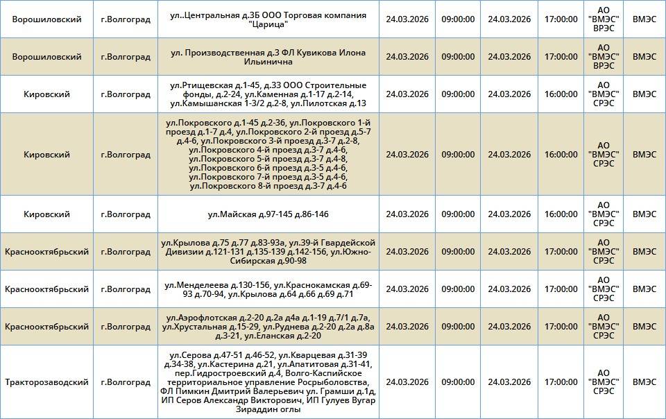 Во вторник, 24 марта, электроэнергию отключат в семи районах Волгограда. Света не будет в Ворошиловском, Советском, Кировском, Краснооктябрьском, Красноармейском, Ворошиловском и Тракторозаводском районах. Об этом сообщает компания «Россети Юг».