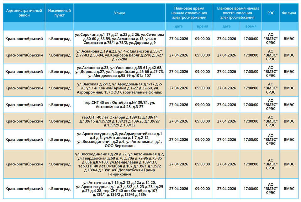 Новая рабочая неделя в Волгограде начнется с массового отключения света. 27 апреля электроэнергии не будет в Краснооктябрьском районе. О временном отключении ресурса сообщили в компании «Россети Юг».
