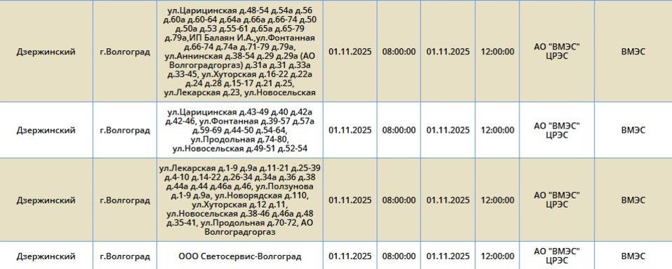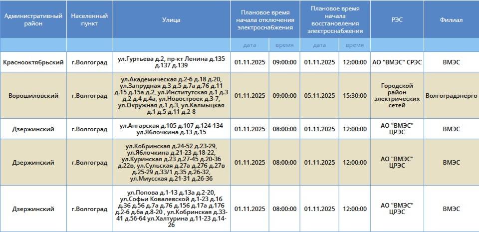 В субботу, 1 ноября, отключение электроэнергии ожидается в трех районах Волгограда. Света не будет в Краснооктябрьском, Ворошиловском и Дзержинском районах. Об этом сообщает компания «Россети Юг».