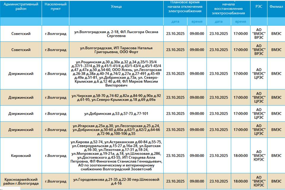В четверг, 23 октября, четыре района Волгограда на несколько часов останутся без электричества. Связано это с проведением на линиях плановых профилактических и ремонтных работ.