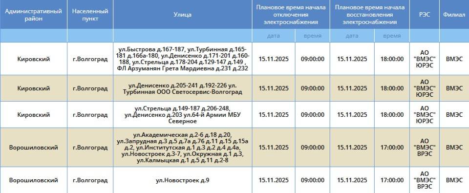 В субботу, 15 ноября, отключение электроэнергии ожидается в двух районах Волгограда. Свет отключат в Кировском и Ворошиловском районах. Об этом сообщает компания «Россети Юг».