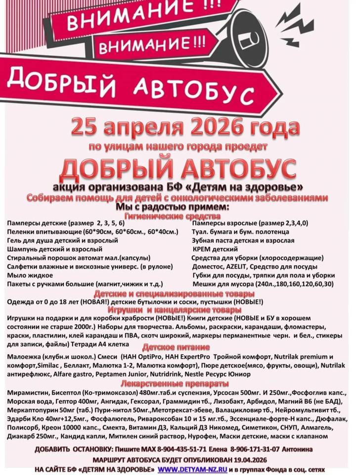 Как рассказали «Городским вестям» организаторы, до 17 апреля благотворительный фонд «Детям на здоровье» принимает заявки на остановки, маршрут автобуса будет опубликован 19 апреля.