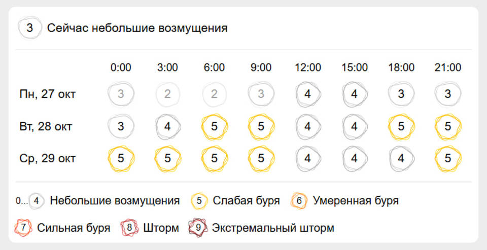 С 18:00: 28 октября до 12:00 29 октября геомагнитные скачки будут равны 5 баллам. С 12:00 до 21:00 скачки вновь снизятся до 4 баллов. С 21:00 до 0:00 они вновь будут равны 5 баллам.