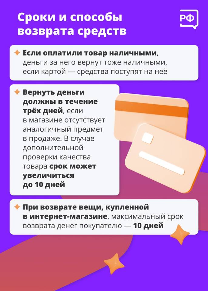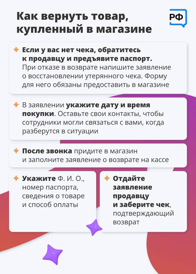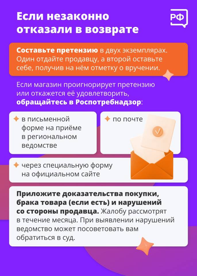 Как вести себя в магазине и что делать, если возврат не принимают, читайте в карусели карточек.