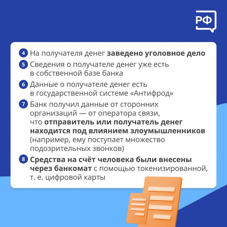 - Банк получил данные от сторонних организаций о том, что отправитель или получатели находятся под влиянием мошенников. Например, оператор связи может сообщить, что абоненту поступают множественные странные звонки.
