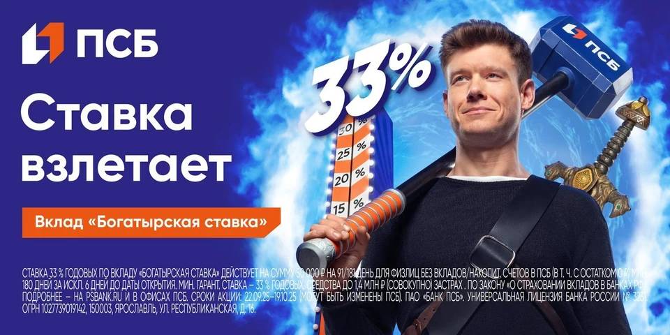 Ставка 33% годовых по вкладу «Богатырская ставка» действует для суммы 50 000 руб. на срок 91, 181 дней для новых вкладчиков, не имевших в банке действующих срочных вкладов и (или) накопительных счетов (в т. ч. с нулевыми остатками) в течение 180 дней, предшествующих дате открытия вклада «Богатырская ставка» (за исключением даты открытия вклада «Богатырская ставка» и 6 календарных дней предшествующих дате открытия вклада «Богатырская ставка»), а также срочных вкладов и (или) накопительных счетов, закрытых в дату открытия вклада «Богатырская ставка» и в течение 180 дней, предшествующих дате открытия вклада «Богатырская ставка». Выплата процентов ежемесячно на иной счет клиента, открытый в банке. Минимальная гарантированная ставка — 33% годовых. Денежные средства по совокупности вкладов и остатков на счетах физлиц застрахованы в пределах 1,4 млн руб. в соответствии с федеральным законом «О страховании вкладов в банках Российской Федерации». Подробная информация — на psbank.ru, по телефону 8 800 333 78 90 (круглосуточно, звонок по России бесплатный) или в офисах банка. Информация актуальна на 26.09.2025.