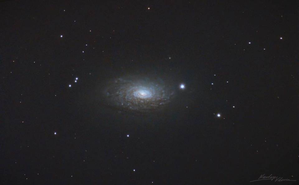 3-й объект - спиральная галактика M63 «Подсолнух» с размытой, «лохматой» структурой рукавов. В отличие от симметричных галактик она выглядит динамично: в ее рукавах постоянно формируются новые звезды.