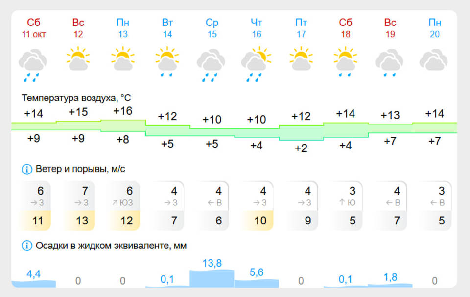 Синоптики сервиса Gismeteo прогнозируют дожди 11, 14-16 и 18-19 октября. В субботу, 11 октября, в Волгограде выпадет 4,4 мм осадков. В четверг, 16 октября, уровень осадков достигнет 5,6 мм. Самый мощный ливень ждет Волгоград 15 октября. Тогда в областной столице выпадет больше половины месячной нормы осадков – 13,8 мм (при норме в 22-24 мм).