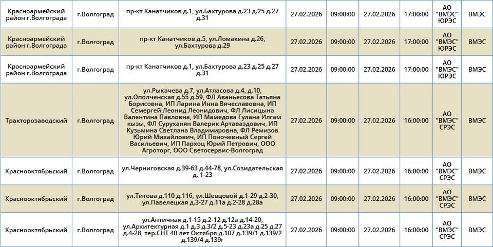 В пятницу, 27 февраля, в пяти районах Волгограда планируется отключение электроэнергии. Света не будет в Краснооктябрьском, Ворошиловском, Дзержинском, Красноармейском и Тракторозаводском районах. Об этом сообщает компания «Россети Юг».