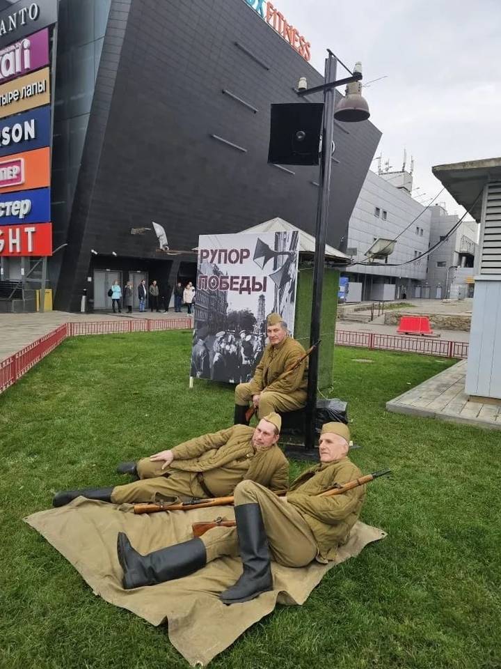 У Ворошиловского ТЦ акция прошла также с использованием громкоговорителя и стилизации под солдатский привал.