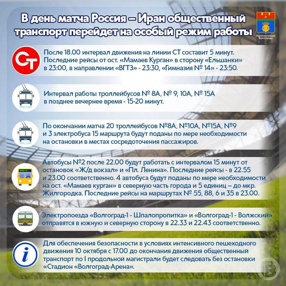 Сегодня, 10 октября, в Волгограде, в день проведения футбольного матча между сборными командами России и Ирана, в вечернее время будет увеличено количество подвижного состава на ряде основных городских маршрутов и сокращен интервал движения общественного транспорта.
