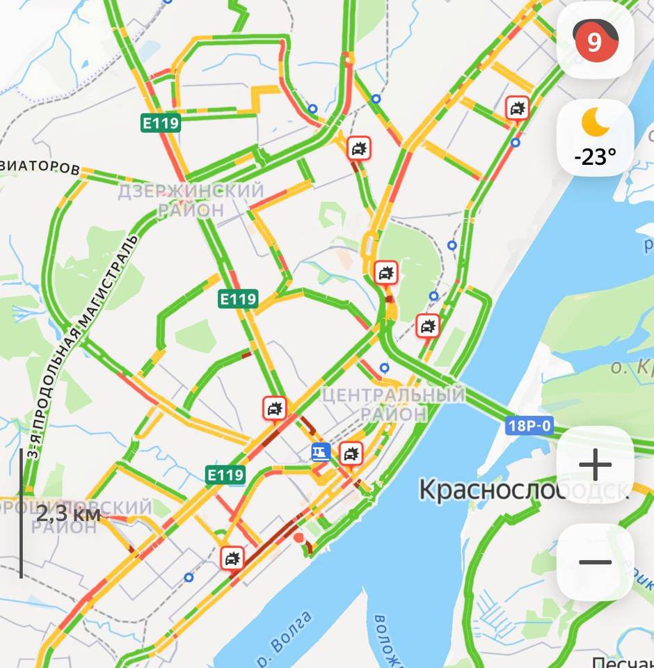 По данным популярного ресурса "Яндекс.Карты" плотность движения привела к образованию автомобильных заторов, которые электронные системы оценили в 9 баллов.