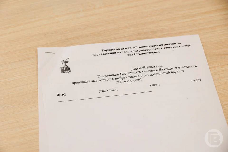 В честь этой важной даты в городе-герое традиционно проходят различные мероприятия. Одним из них в этом году стала просветительская акция по истории битвы на Волге под названием «Сталинградский диктант». На площадке амфитеатра, в центре креативных индустрий «Волга», 30 участников из числа школьников, представителей патриотических и молодежных объединений, студентов, специалистов, активистов проверили, насколько хорошо они знают историю своего города. Акция организована департаментом по образованию администрации Волгограда при поддержке городского комитета молодежной политики и туризма.