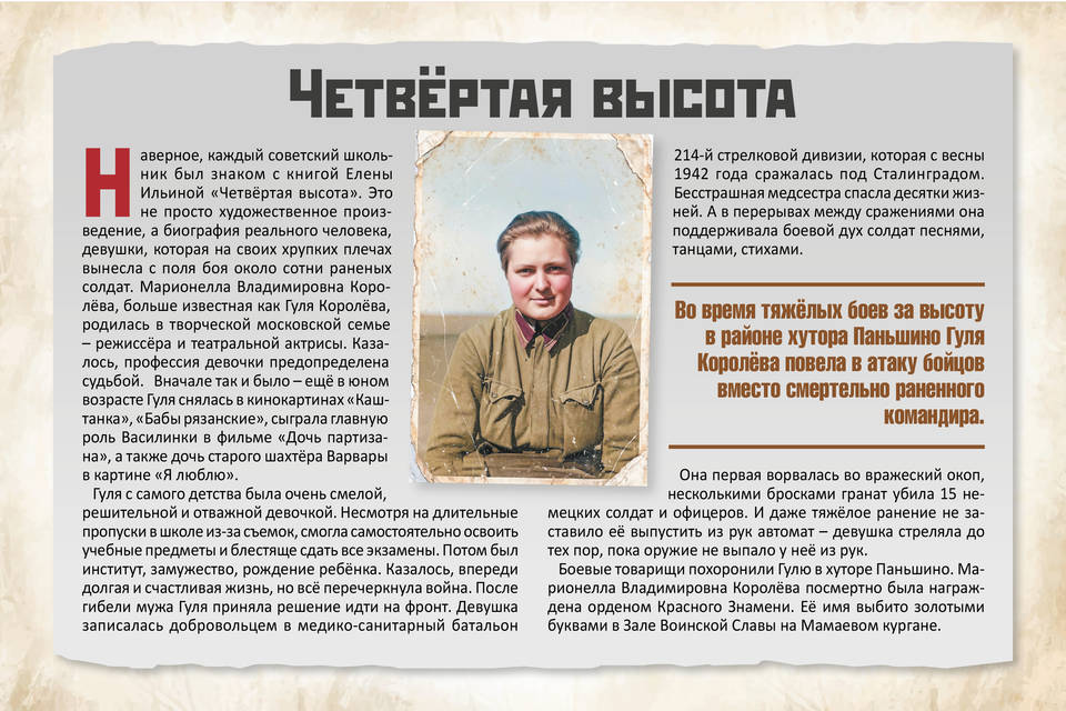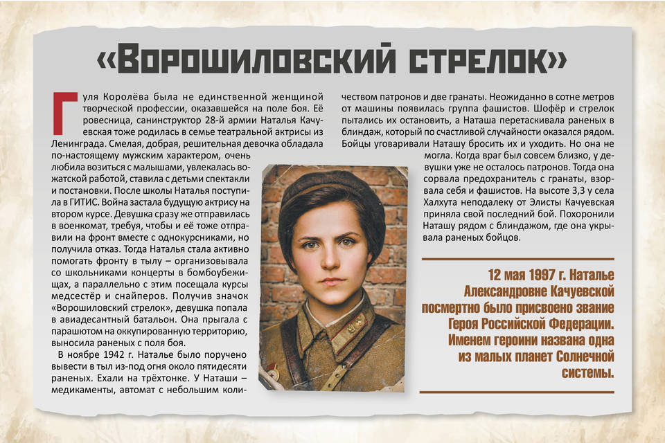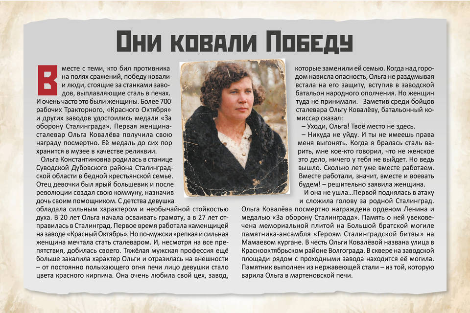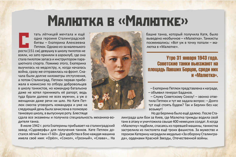 Первая женщина-сталевар Ольга Ковалева, защищающая свой город с оружием в руках, отважная медсестра Гуля Королева, вынесшая с поля боя сотни раненых бойцов, юная летчица Лидия Литвяк, храбрая танкистка-малютка Екатерина Петлюк, на счету у которой более 400 убитых врагов, актриса-санинструктор Наталья Качуевская, - их имена навсегда вписаны в историю Великой Отечественной войны. В преддверии 8 Марта «Городские вести» вспомнили о прекрасных созданиях, которые наравне с мужчинами отважно сражались за Родину. Информацию о женщинах в солдатских шинелях и фотографии предоставили специалисты музея-заповедника «Сталинградская битва».